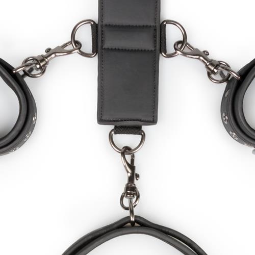 Zestaw składa się z paska uprzęży, kajdanek i kołnierza. Zarówno mankiety, jak i kołnierz można łatwo regulować, aby idealnie pasowały. Wytrzymała skóra jest wyłożona pianką, aby zapobiec zarysowaniu i zapewnić wygodne użytkowanie. Taśma ma dziewięć małych pierścieni typu D i jeden duży pierścień D-ring. Mankiety i kołnierz są przymocowane do klamer, dzięki czemu można je łatwo przymocować do uprzęży. Z powodu długości paska i wielu D-ringów możesz stworzyć własną grę niewoli i używać tego zestawu w dowolny sposób.