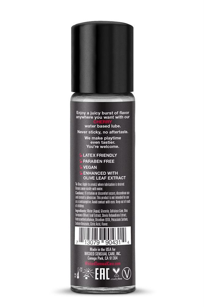 Keep calm and cherry on! Kissable, lickable, and delicious, Wicked Aqua Cherry personal lubricant adds subtle and delicious natural flavours to enhance oral pleasures. Light and silky, this water-based formula is the perfect sensual combination of an elegant lubricant and a flavor sensation. Never sticky and without an aftertaste, Wicked Aqua Cherry satisfies your sweet tooth and your intimate desires all in one amazing pleasure product. Oral sex never tasted so good. Whether you are giving or receiving, Wicked flavours will give you a new sexy confidence.30 mlLong lastingLatex friendlyParaben freeNever stickyNo aftertasteEnhanced with Olive Leaf ExtractVegan- no animal by-products or testing