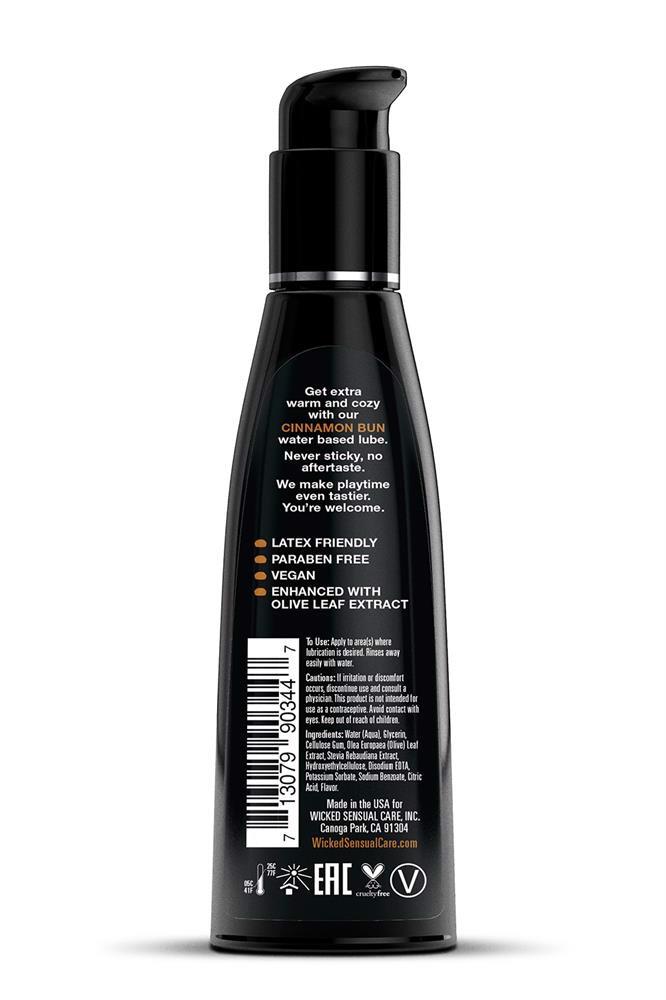 So delicious you’d think it’s the real thing! Wicked Aqua Cinnamon Bun personal lubricant adds subtle and delicious natural flavours to enhance oral pleasures. Light and silky, this water-based formula is the perfect sensual combination of an elegant lubricant and a flavour sensation. Never sticky and without an aftertaste, Wicked Aqua Cinnamon Bun satisfies your sweet tooth and your intimate desires all in one amazing pleasure product. Oral sex never tasted so good. Whether you are giving or receiving, Wicked flavours will give you new sexy confidence. Wicked flavoured lubes are sweetened with Stevia, making them safe for oral, vaginal and anal play.120 mlLong lastingLatex friendlyParaben-freeNever stickyNo aftertasteEnhanced with Olive Leaf ExtractSweetened with SteviaVegan – no animal by-products or testingUse: Apply to area(s) where lubrication is desired. Cleans away easily with water.Ingredients: Water, Glycerin, Cellulose Gum, Stevia Rebaudiana Extract, Olea Europaea (Olive) Leaf Extract, Hydroxyethylcellulose, Tetradsodium EDTA, Citric Acid, Sodium Benzoate, Potassium Sorbate, Flavour.