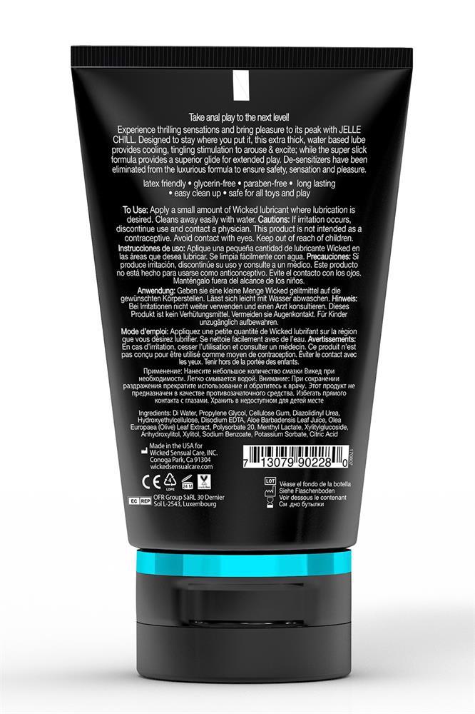 Take anal play to the next level! Experience thrilling sensations and bring pleasure to its peak with Jelle Chill. Designed to stay where you put it, this extra thick, water based lube provides cooling, tingling sensations to arouse and excite while the super slick formula provides a superior glide for extended play. De-sensitizers have been eliminated from the luxurious formula to ensure safety, sensation and pleasure.Latex friendlyGlycerin freeParaben freeLong lastingEasy clean-uppH balancedGentle cooling and tingling sensationsUse: Apply a small amount of Jelle Chill where lubrication is desired. Cleans away easily with water.Ingredients: DI Water, Propylene Glycol, Cellulose Gum, Diazolidiny Urea, Hydroxyetholcellulose, Disodium EDTA, Aloe Barbadensis Leaf Juice, Olea Europaea (Olive) Leaf Extract, Polysorbate 20, Menthyl Lactate, Xylitylglucoside, Anhydroxylitol, Xylitol, Sodium Benzoate, Potassium Sorbate, Citric Acid.