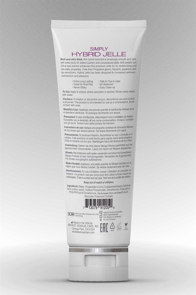 Wicked is all about providing choice in their formulas and the Simply line really complements the Wicked Sensual Care line of products, while catering to the people who are particularly picky about the ingredients of their lube. The Simply product line offers the Wicked Sensual Care quality with some new benefits.Simply lubricants are made without Glycerin, Propylene Glycol, or Parabens and are cruelty free and vegan. Like all Wicked Sensual Care formulas, they’re enhanced with Wickeds signature Olive Leaf Extract that inhibits the spread of harmful bacteria and microorganisms. When you’re ready for a clean lube, do it Simply. Simply Hybrid Jelle is the thickest jelle formula to date from Wicked. It is slick, long lasting, and has an amazing play time. Also safe for all toys. Rich and ultra-thick, simply Hybrid Jelle is a clean, premium hybrid lubricant that is amazingly smooth and slick, with extra body for added cushion and unsurpassed glide.Antioxidant-rich Olive Leaf Extract enhances this formula with its moisturizing and biostatic properties. Free of Glycerin, Propylene Glycol, and Parabens. Vegan, cruelty free and PH balanced.