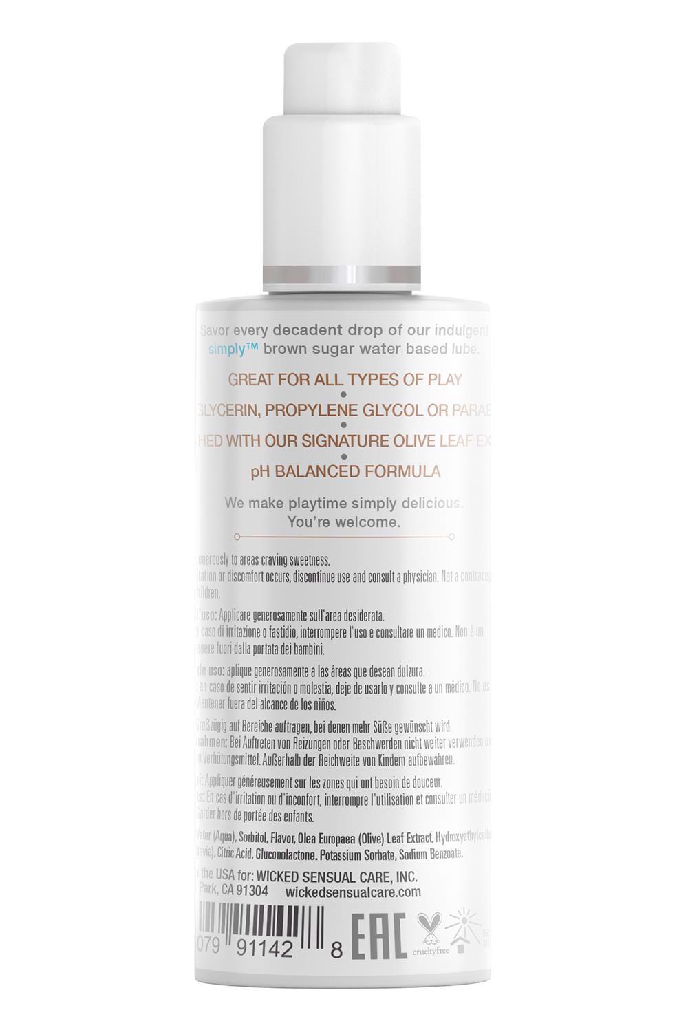 Savor every decadent drop of this indulgent Simply™ brown sugar water based lube. Wicked just made playtime simply delicious. Simply™ Brown Sugar is a clean and simple flavored lubricant.Waterbased flavored lubricant70 mlBrown Sugar flavorPropylene glycol freeGlycerin freeWith olive leaf extractSweetened with SteviaCruelty freeVeganpH balanced