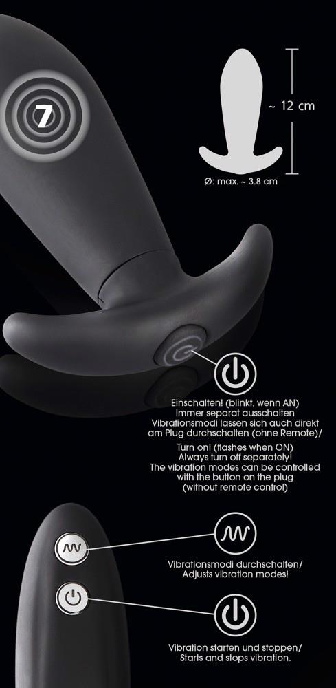 Jedwabiście gładka wtyczka analna z 7 trybami wibracji. Sterowanie odbywa się za pomocą przycisku lub pilota. Stożkowa wtyczka jest łatwa do włożenia i zapewnia przyjemne uczucie pełności. Szeroka podstawa zapewnia pewne trzymanie i może być również używana jako uchwyt. Idealny dla początkujących! Baterie w zestawie.